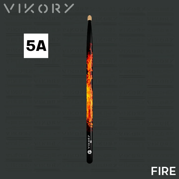 Vikory Fire 5A — la 5A polyvalente par excellence : hickory certifié FSC et hygrométrie maîtrisée pour une durabilité accrue et moins de vibrations. Design en noir et flammes avec extrémités noires et olive en bois brut — style, confort et équilibre en répétition comme sur scène.