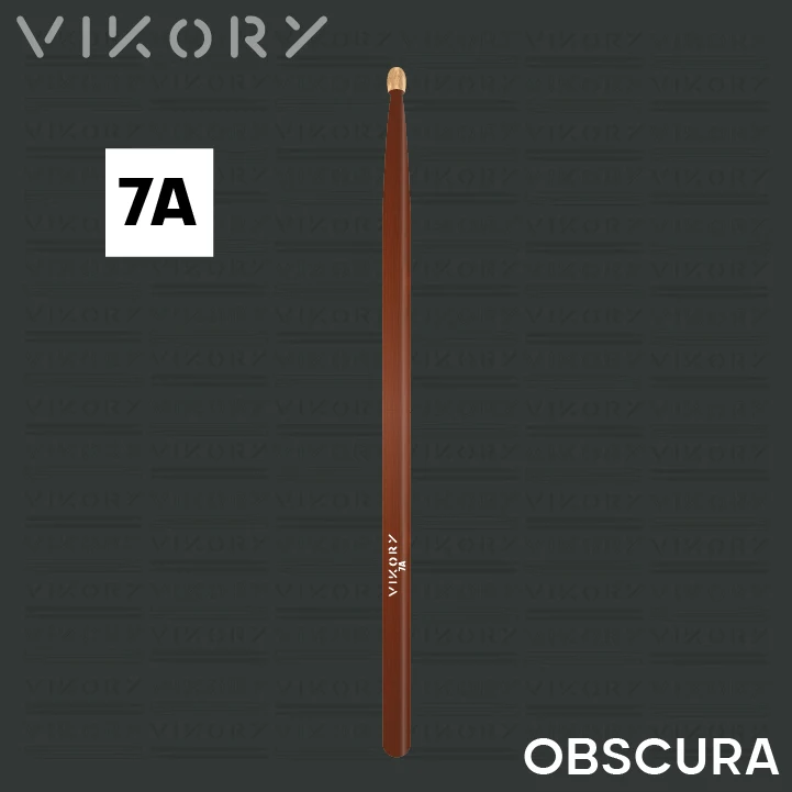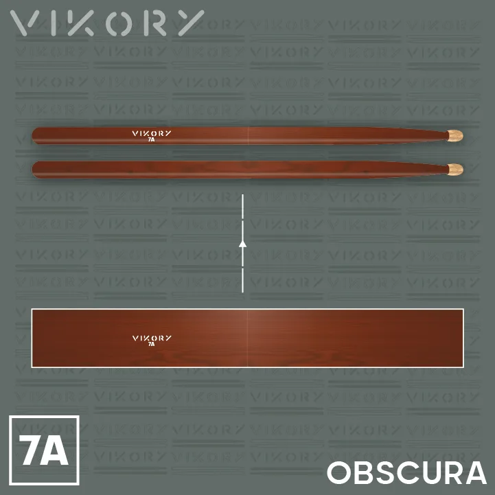 Paire de baguettes de batterie Vikory Obscura 7A — La 7A légère et précise, idéale pour le jazz, les sets acoustiques et les nuances fines: hickory certifié FSC et hygrométrie maîtrisée pour une durabilité accrue et moins de vibrations. Design boois teinté et olive en bois brut — style, confort et équilibre en répétition comme sur scène.