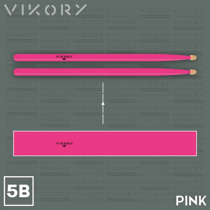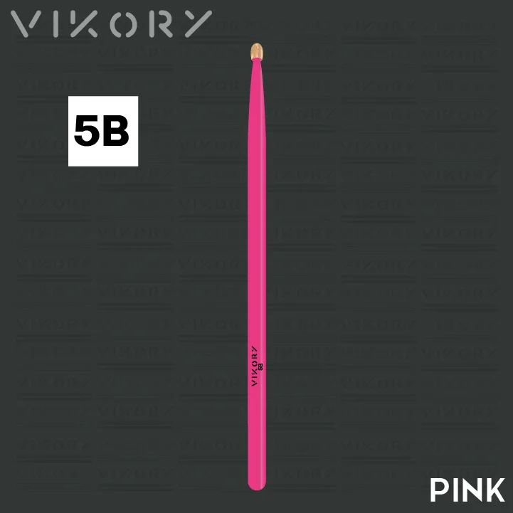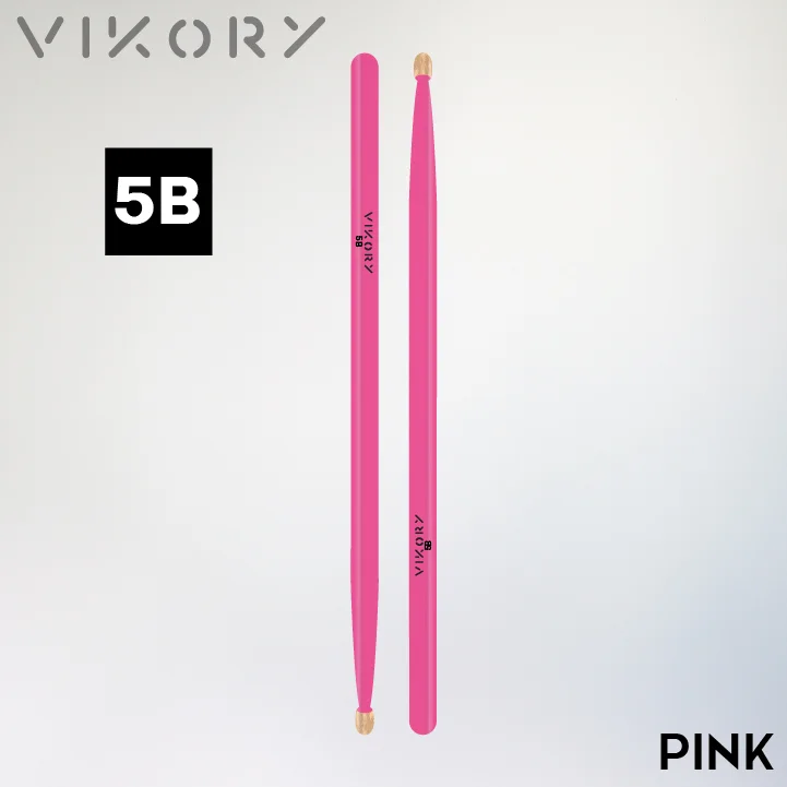 Paire de baguettes de batterie Vikory Pink 5B (roses) — ldéale pour le rock, la pop, le punk et la pop, les répétitions et pour la pratique : hickory certifié FSC et hygrométrie maîtrisée pour une durabilité accrue et moins de vibrations. Design de couler rose et olive en bois brut — style, confort et équilibre en répétition comme sur scène.