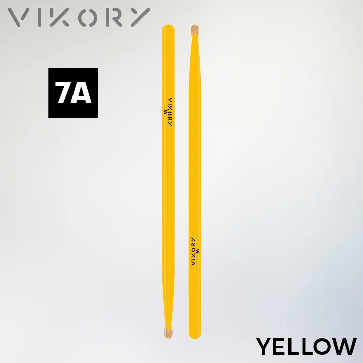 Paire de baguettes de batterie Vikory Yellow 7A — La 7A légère et précise, idéale pour le jazz, les sets acoustiques et les nuances fines: hickory certifié FSC et hygrométrie maîtrisée pour une durabilité accrue et moins de vibrations. Design de couler jaune et olive en bois brut — style, confort et équilibre en répétition comme sur scène.